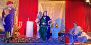 Long panels of fabric were hung on the walls to create a palace feel. Upholstery fabric found in a box became carpet in the throne area. A curtain became a rug for the chaise lounge. Wood cubes used in another production were painted gray. Benches from a past production were used, too. Small white columns were used to further set the play’s scene.
